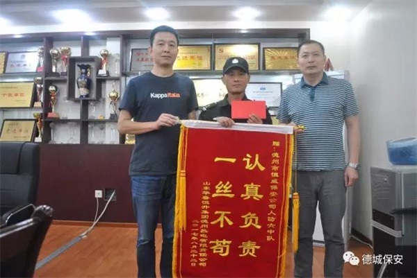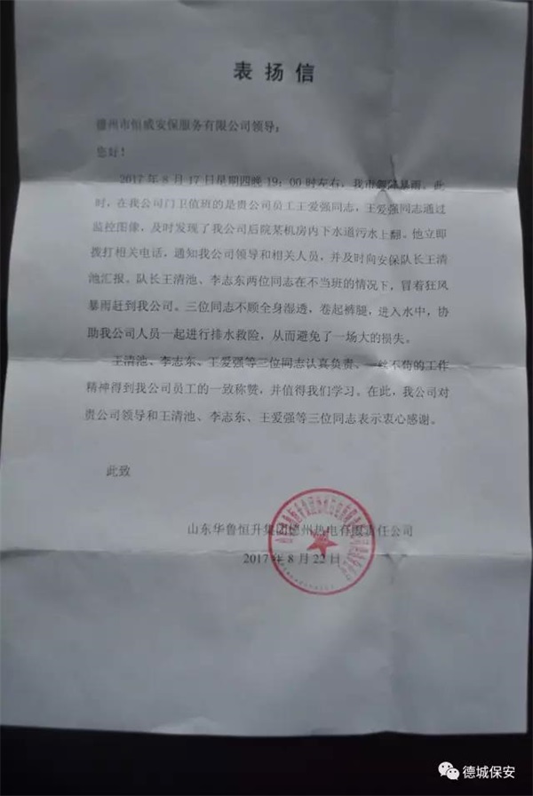 8月28日上午,山東華魯恒升集團(tuán)德州熱電有限責(zé)任公司安保部段主任在派駐保安執(zhí)勤班班長王清池的陪同下,來到德州市恒威安保服務(wù)有限公司,感謝在8.17特大暴雨中及時排除重大險情的三名保安隊(duì)員。贈送“一絲不茍、認(rèn)真負(fù)責(zé)”錦旗一面、表揚(yáng)信一封。
