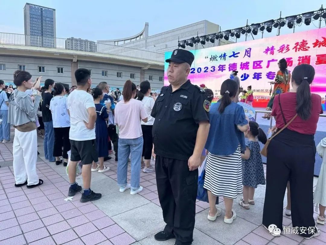 7月16日-8月3日,德城區(qū)廣場消夏晚會在中心廣場成功舉辦,本次消夏晚會歷時19天、共計15場精彩紛呈的文藝演出。為確保消夏晚會安全有序進(jìn)行,德州市恒威安保服務(wù)有限公司受主辦方委托,承擔(dān)了本次消夏晚會秩序維護(hù)、治安巡邏、突發(fā)事件處理等安保服務(wù)任務(wù)。