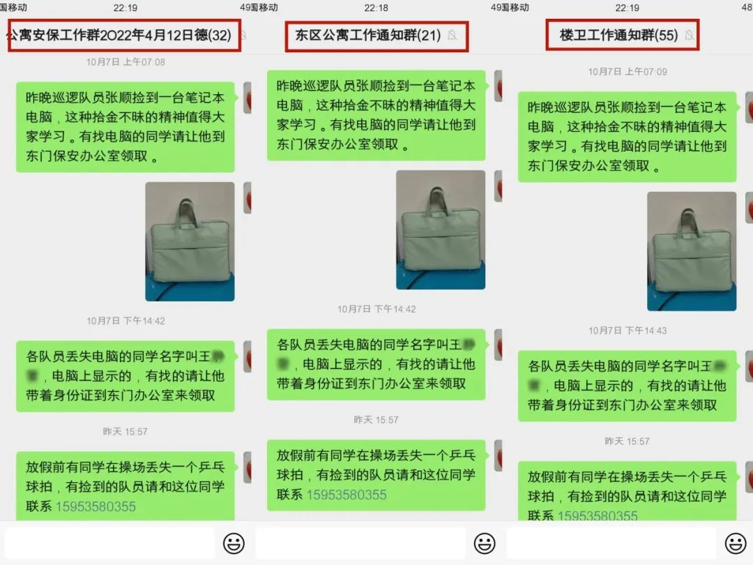 10月6日晚上,恒威安保駐德州學(xué)院班組保安員張順在校園例行巡邏過程中,在路過14號公寓時,看到一輛共享單車車把上掛著一個藍(lán)色辦公包,里面裝有筆記本電腦等物品,疑似被人遺忘在車上。張順擔(dān)心失主發(fā)現(xiàn)東西丟失后返回尋找,便在原地等待了半個小時,但失主遲遲未出現(xiàn),張順便將現(xiàn)場情況向隊長劉明剛報告,并將電腦包移交校園警務(wù)室,同時在工作群中發(fā)布失物招領(lǐng)信息。