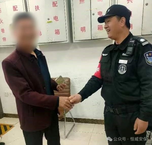 2024年4月15日上午9時許,正在山東大學(xué)齊魯醫(yī)院德州醫(yī)院執(zhí)勤巡邏的保安員祝少國,在醫(yī)院門口的吸煙處發(fā)現(xiàn)一部手機,他立即告知在崗隊員一起尋找失主,經(jīng)調(diào)取監(jiān)控,發(fā)現(xiàn)失主將手機遺忘在吸煙處,向醫(yī)院外走了,由于手機設(shè)有密碼,無法聯(lián)系到失主,保安員祝少國便將手機放在值班室,等待失主來電,終于在9點半左右,失主打來電話,祝少國向失主說明情況,失主匆匆趕來。手機解鎖后,祝少國將手機歸還失主,失主隨即掏出300元錢遞給祝少國以示感謝。但被祝師傅直接拒絕并表示:“分內(nèi)之事,這是我們應(yīng)該做的。”失主對祝少國伸出大拇指,連聲道謝,咱們保安員真棒!
