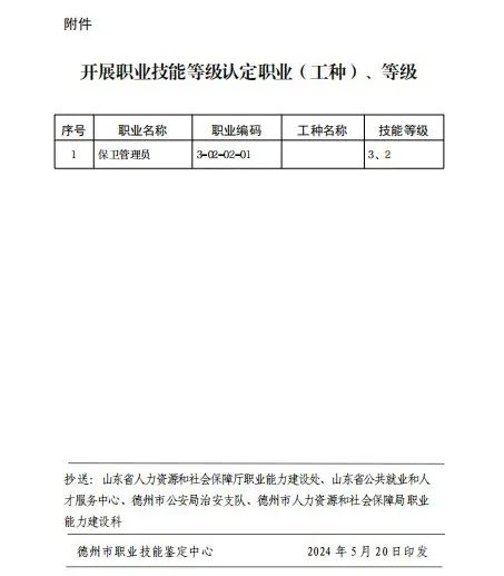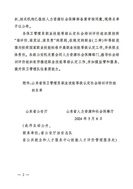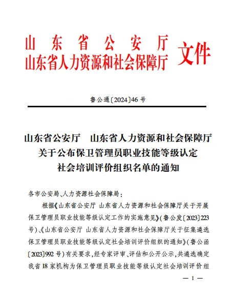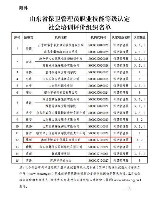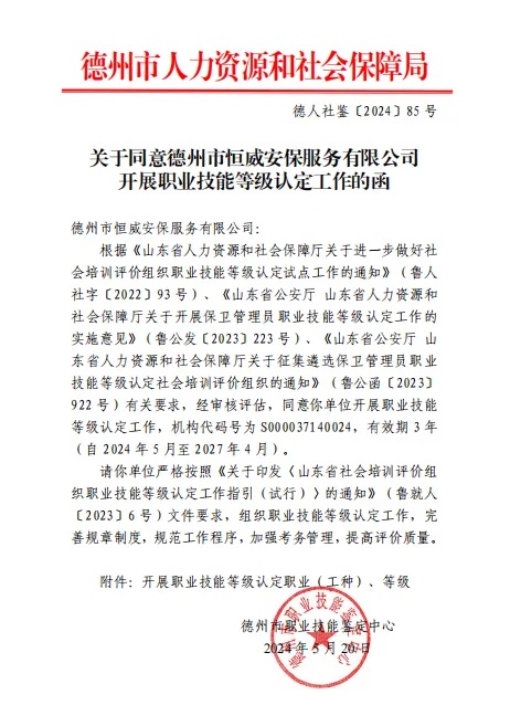 根據《山東省公安廳 山東省人力資源和社會保障廳關于開展保衛(wèi)管理員職業(yè)技能等級認定工作的實施意見》(魯公發(fā)[2023]223號)、山東省公安廳山東省人力資源和社會保障廳關于征集遴選保衛(wèi)管理員職業(yè)技能等級認定社會培訓評價組織的通知》(魯公函[2023]992號)有關要求,經專家評審、評估和公開公示,遴選確定德州市恒威安保服務有限公司為保衛(wèi)管理員職業(yè)技能等級認定社會培訓評價機構,是德州市唯一一家可面向社會開展保衛(wèi)管理員職業(yè)技能等級認定工作的機構。