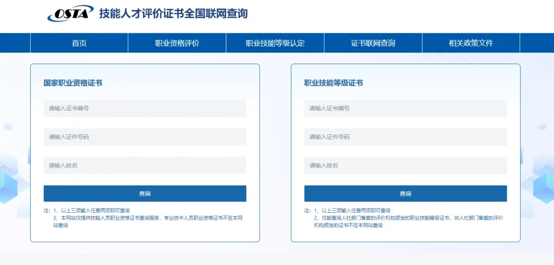 技能人才評價證書全國聯網查詢 http://zscx.osta.org.cn/