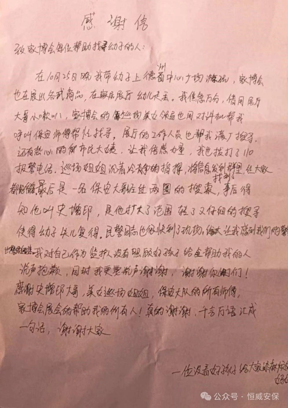 10月25日晚上8點(diǎn)10分,家博展覽會(huì)現(xiàn)場(chǎng),一名幼童不慎與家人走散,家長(zhǎng)發(fā)現(xiàn)孩子不見后,焦急萬(wàn)分,立即向展會(huì)保安尋求幫助。恒威安保駐家博會(huì)執(zhí)勤保安員史增印得知這一緊急情況后,立即通過(guò)展廳內(nèi)的擴(kuò)音設(shè)備呼喊幼童名字,并使用對(duì)講機(jī)告知展會(huì)內(nèi)各點(diǎn)位的巡邏崗,詳細(xì)描述了丟失幼童的特征,要求所有隊(duì)員緊急尋找,并發(fā)動(dòng)周圍熱心群眾參與尋找。