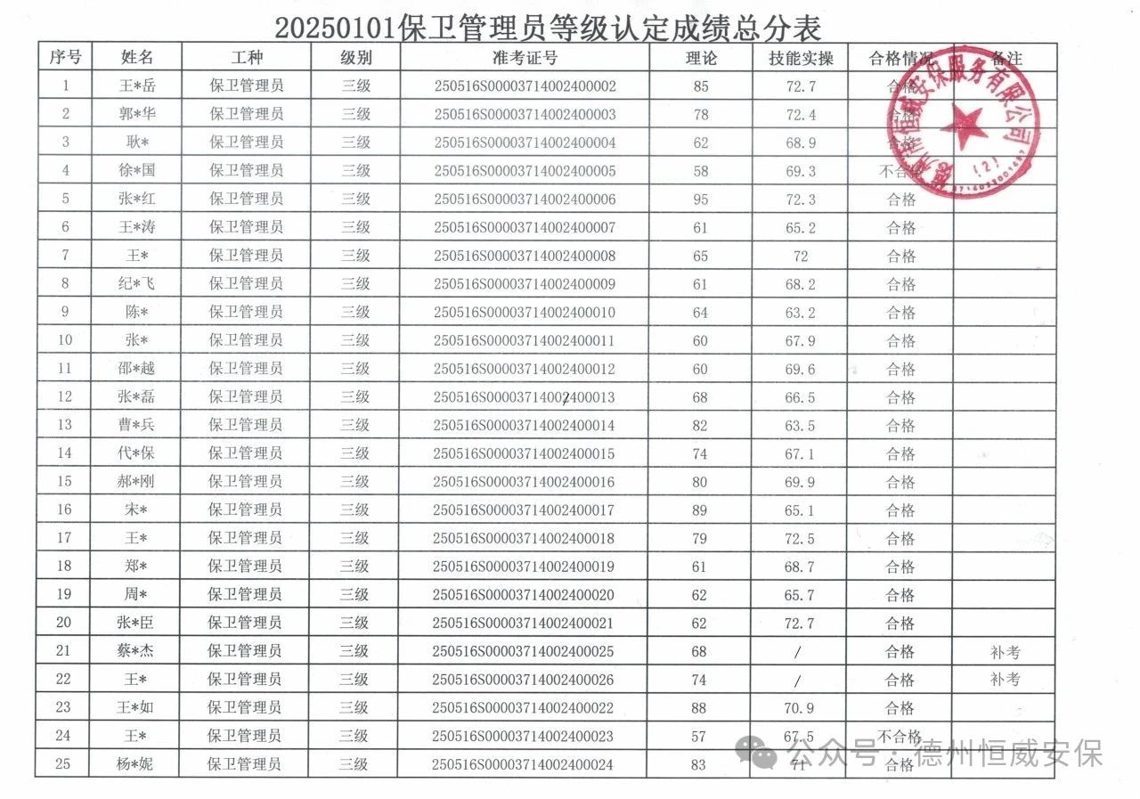 德州市第二批保衛(wèi)管理員(三級)職業(yè)技能等級認定成績公示: