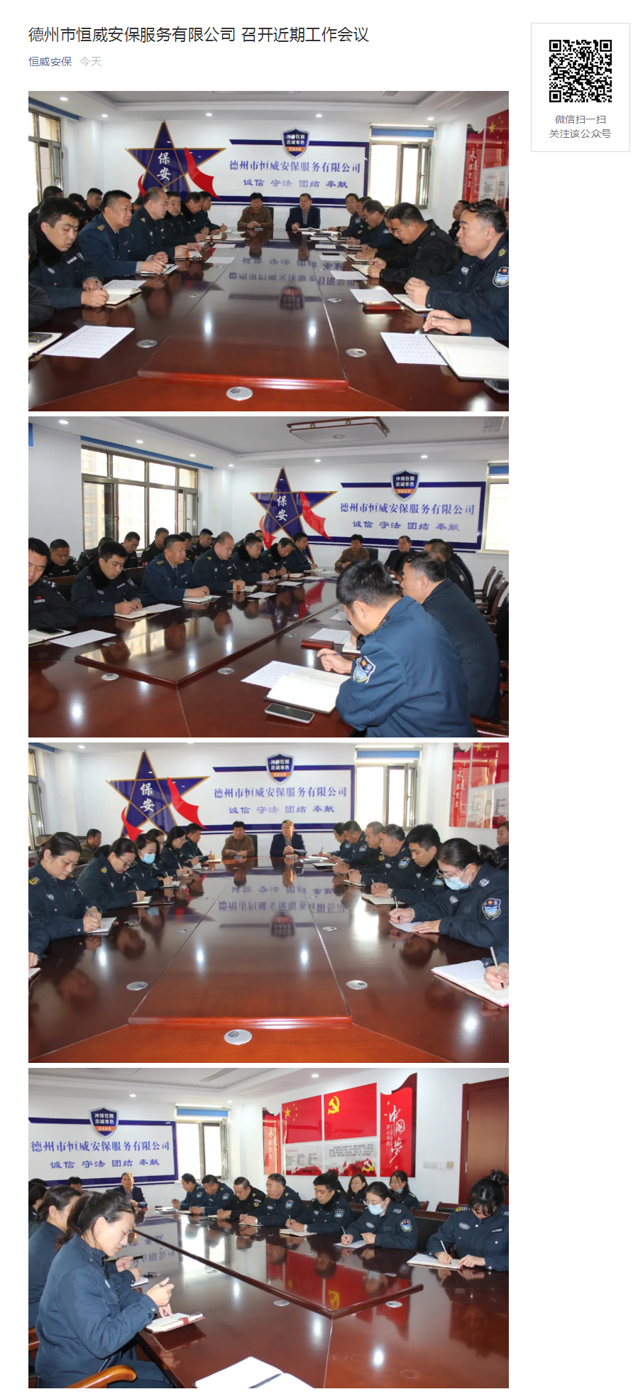 11月16日,德州市恒威安保服務(wù)有限公司召開會議,對近期工作進行安排部署。會議由公司總經(jīng)理王新衛(wèi)主持,中層以上管理人員參加。